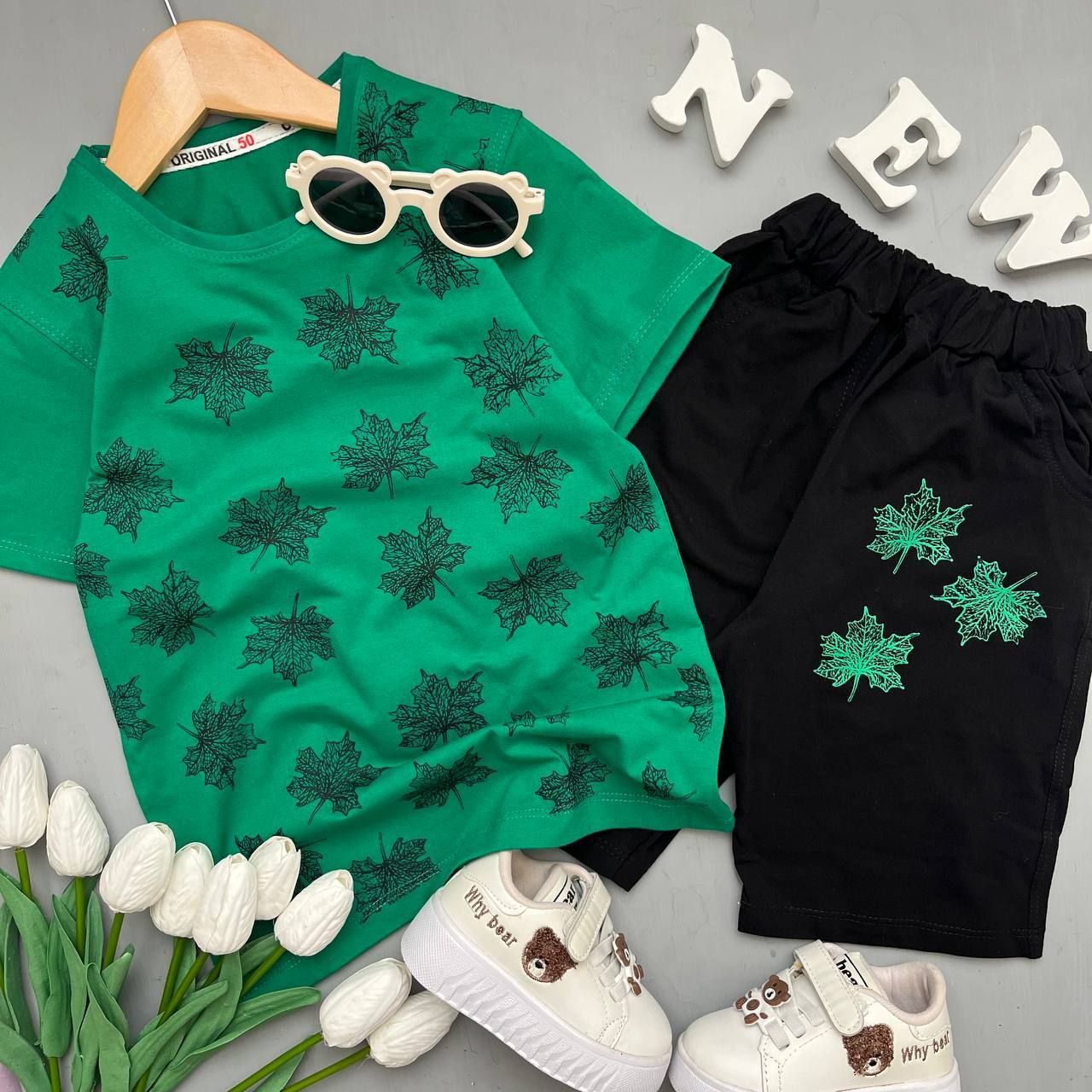 ست تیشرت و شلوارک پنبه لاکرا پسرانه طرح برگ