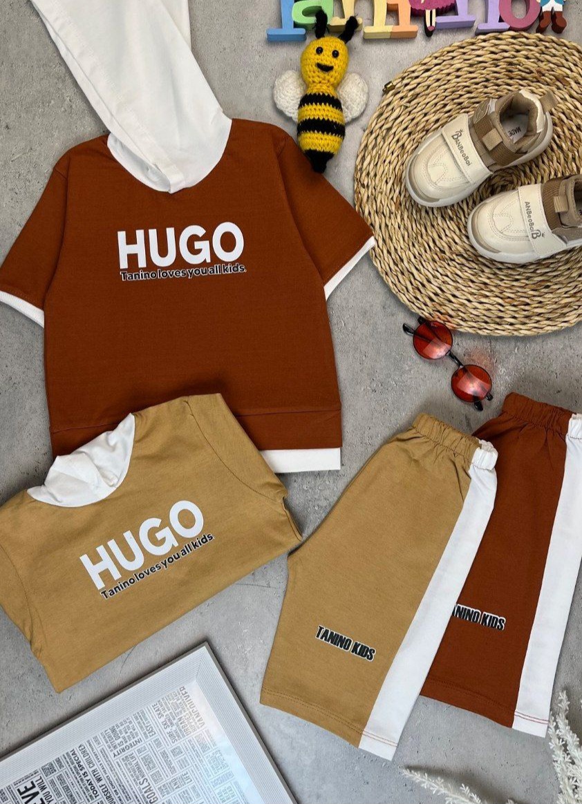 ست تیشرت و شلوارک راحتی اقتصادی پنبه یک رو پسرانه کلاهدار طرح هوگو