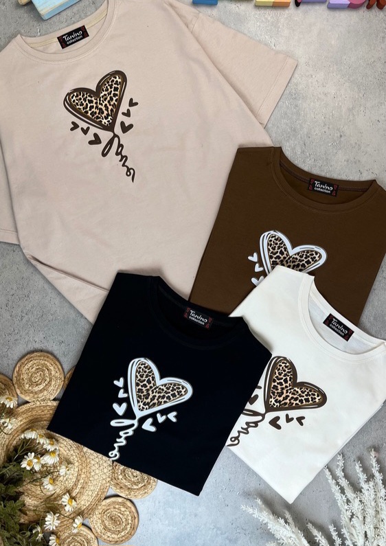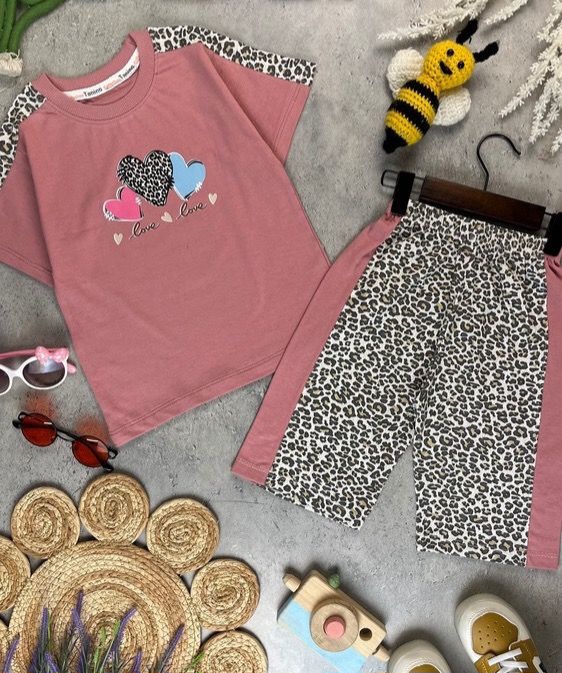 ست تیشرت و شلوارک راحتی اقتصادی پنبه یک رو دخترانه مدل پلنگی قلبی