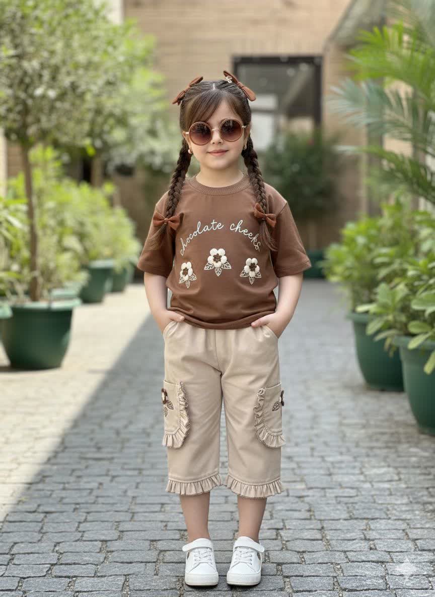 ست کراپ پنبه و شلوارک کتان بنگال دخترانه مدل سه گل