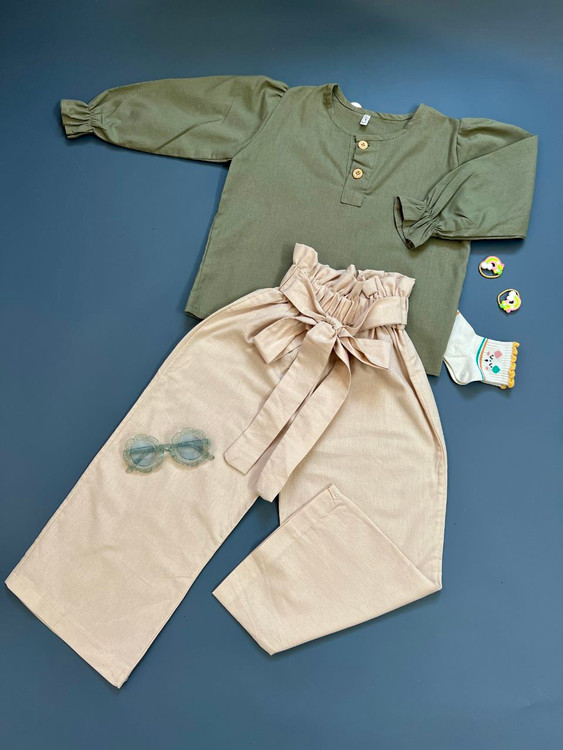 رنگبندی: تک رنگ شومیز یشمی و شلوار کرم